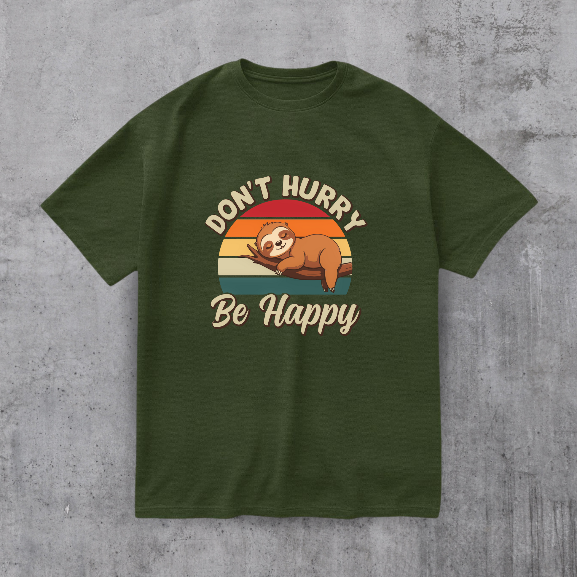 DONT HURRY BE HAPPY graphic printed on high-quality cotton. Available in multiple fits and colors. Free shipping included.